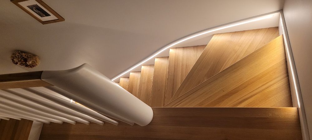 Schody dębowe zabiegowe na beton Gdańsk, widok z dołu na stopnie i białe podstopnice